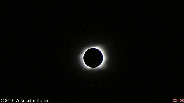 This video of Total Solar Eclipse 2010 consists of frames 3000 ... 3999 (out of 10400) shot by the co-author by a Panasonic HDC SD707 high definition video camera. It's a preliminary version with 1/3 of original resolution. Processing: All frames of this video were extracted as JPEGs from the original video (1920x1080). Some (too dark) portions were a bit enhanced in contrast. At end of totality (see parts 9 and 10) the color contrast was enhanced to improve view of chromosphere and prominences. Then all frames were downscaled to 1/3 of original resolution (640x360) and Copyright of the co-author Waltraud Kraußer-Blättner and frame number were inserted at lower left/right border. After that procedure a GIF animation was produced out of the single frames to ensure playing by all browsers without need of proprietary video codec plugins (this, of course, has the disadvantage of not providing sound ...). The built-in delay between frames is set to 40 ms which gives a maximum frame rate equal to the frame rate of the original video of 25 frames/sec (depending on capabilities and performance of Your browser and computer). |