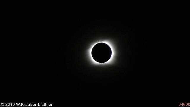 This video of Total Solar Eclipse 2010 consists of frames 4000 ... 4999 (out of 10400) shot by the co-author by a Panasonic HDC SD707 high definition video camera. It's a preliminary version with 1/3 of original resolution. Processing: All frames of this video were extracted as JPEGs from the original video (1920x1080). Some (too dark) portions were a bit enhanced in contrast. At end of totality (see parts 9 and 10) the color contrast was enhanced to improve view of chromosphere and prominences. Then all frames were downscaled to 1/3 of original resolution (640x360) and Copyright of the co-author Waltraud Kraußer-Blättner and frame number were inserted at lower left/right border. After that procedure a GIF animation was produced out of the single frames to ensure playing by all browsers without need of proprietary video codec plugins (this, of course, has the disadvantage of not providing sound ...). The built-in delay between frames is set to 40 ms which gives a maximum frame rate equal to the frame rate of the original video of 25 frames/sec (depending on capabilities and performance of Your browser and computer). |
