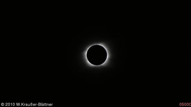This video of Total Solar Eclipse 2010 consists of frames 5000 ... 5999 (out of 10400) shot by the co-author by a Panasonic HDC SD707 high definition video camera. It's a preliminary version with 1/3 of original resolution. Processing: All frames of this video were extracted as JPEGs from the original video (1920x1080). Some (too dark) portions were a bit enhanced in contrast. At end of totality (see parts 9 and 10) the color contrast was enhanced to improve view of chromosphere and prominences. Then all frames were downscaled to 1/3 of original resolution (640x360) and Copyright of the co-author Waltraud Kraußer-Blättner and frame number were inserted at lower left/right border. After that procedure a GIF animation was produced out of the single frames to ensure playing by all browsers without need of proprietary video codec plugins (this, of course, has the disadvantage of not providing sound ...). The built-in delay between frames is set to 40 ms which gives a maximum frame rate equal to the frame rate of the original video of 25 frames/sec (depending on capabilities and performance of Your browser and computer). |