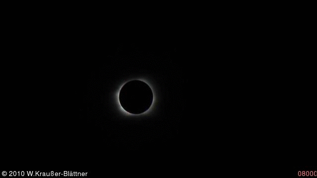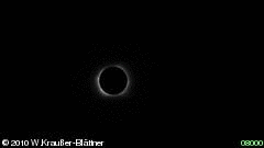 This video of Total Solar Eclipse 2010 consists of frames 8000 ... 8999 (out of 10400) shot by the co-author by a Panasonic HDC SD707 high definition video camera. It's a preliminary version with 1/3 of original resolution. Processing: All frames of this video were extracted as JPEGs from the original video (1920x1080). Some (too dark) portions were a bit enhanced in contrast. At end of totality (see parts 9 and 10) the color contrast was enhanced to improve view of chromosphere and prominences. Then all frames were downscaled to 1/3 of original resolution (640x360) and Copyright of the co-author Waltraud Kraußer-Blättner and frame number were inserted at lower left/right border. After that procedure a GIF animation was produced out of the single frames to ensure playing by all browsers without need of proprietary video codec plugins (this, of course, has the disadvantage of not providing sound ...). The built-in delay between frames is set to 40 ms which gives a maximum frame rate equal to the frame rate of the original video of 25 frames/sec (depending on capabilities and performance of Your browser and computer). |