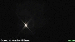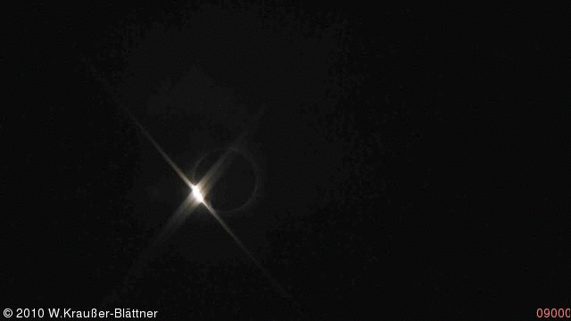 This video of Total Solar Eclipse 2010 consists of frames 9000 ... 9999 (out of 10400) shot by the co-author by a Panasonic HDC SD707 high definition video camera. It's a preliminary version with 1/3 of original resolution. Processing: All frames of this video were extracted as JPEGs from the original video (1920x1080). Some (too dark) portions were a bit enhanced in contrast. At end of totality (see parts 9 and 10) the color contrast was enhanced to improve view of chromosphere and prominences. Then all frames were downscaled to 1/3 of original resolution (640x360) and Copyright of the co-author Waltraud Kraußer-Blättner and frame number were inserted at lower left/right border. After that procedure a GIF animation was produced out of the single frames to ensure playing by all browsers without need of proprietary video codec plugins (this, of course, has the disadvantage of not providing sound ...). The built-in delay between frames is set to 40 ms which gives a maximum frame rate equal to the frame rate of the original video of 25 frames/sec (depending on capabilities and performance of Your browser and computer). |