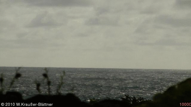 This video of Total Solar Eclipse 2010 consists of frames 10000 ... 10400 (out of 10400) shot by the co-author by a Panasonic HDC SD707 high definition video camera. It's a preliminary version with 1/3 of original resolution. Processing: All frames of this video were extracted as JPEGs from the original video (1920x1080). Some (too dark) portions were a bit enhanced in contrast. At end of totality (see parts 9 and 10) the color contrast was enhanced to improve view of chromosphere and prominences. Then all frames were downscaled to 1/3 of original resolution (640x360) and Copyright of the co-author Waltraud Kraußer-Blättner and frame number were inserted at lower left/right border. After that procedure a GIF animation was produced out of the single frames to ensure playing by all browsers without need of proprietary video codec plugins (this, of course, has the disadvantage of not providing sound ...). The built-in delay between frames is set to 40 ms which gives a maximum frame rate equal to the frame rate of the original video of 25 frames/sec (depending on capabilities and performance of Your browser and computer). |